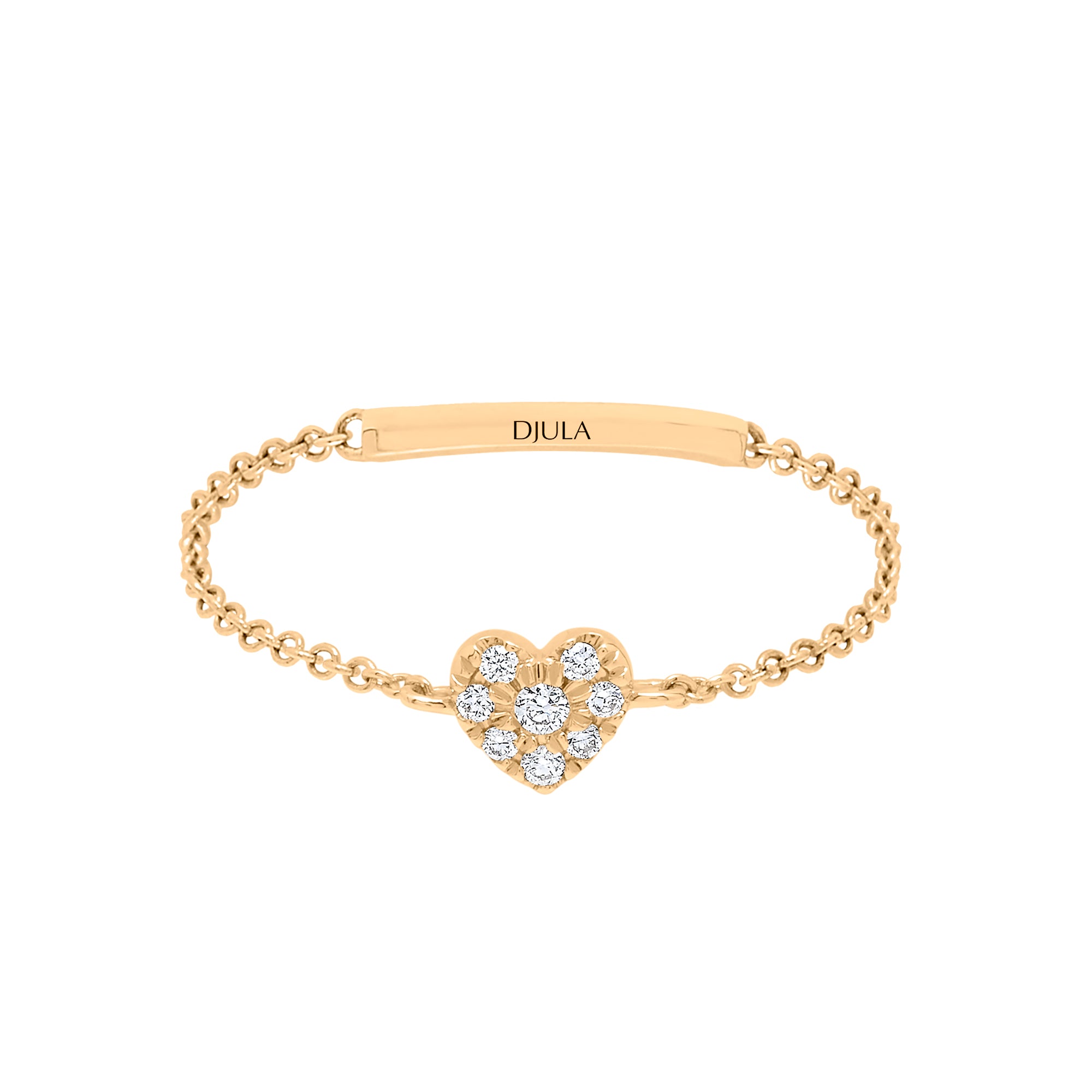 Anillo tipo Skinring de la marca Djula elaborado en oro amarillo 18kt y engastado con diamantes que suman un total de 0.04 quilates. Su diseño presenta un delicado motivo central en forma de corazón que aporta brillo y un estilo femenino y elegante.
