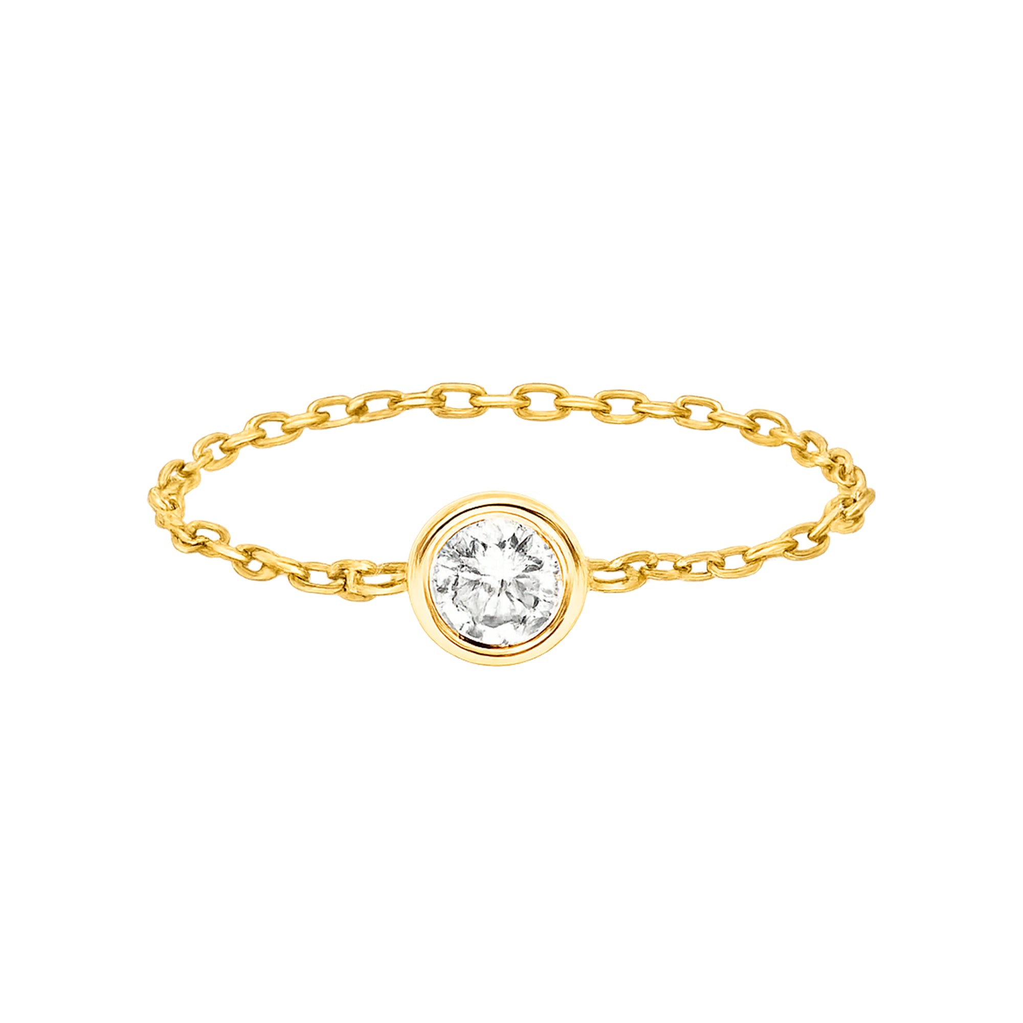 La fina cadena de oro crea un efecto ligero y flexible que se adapta cómodamente al dedo, convirtiéndolo en una pieza moderna y delicada ideal para el uso diario.