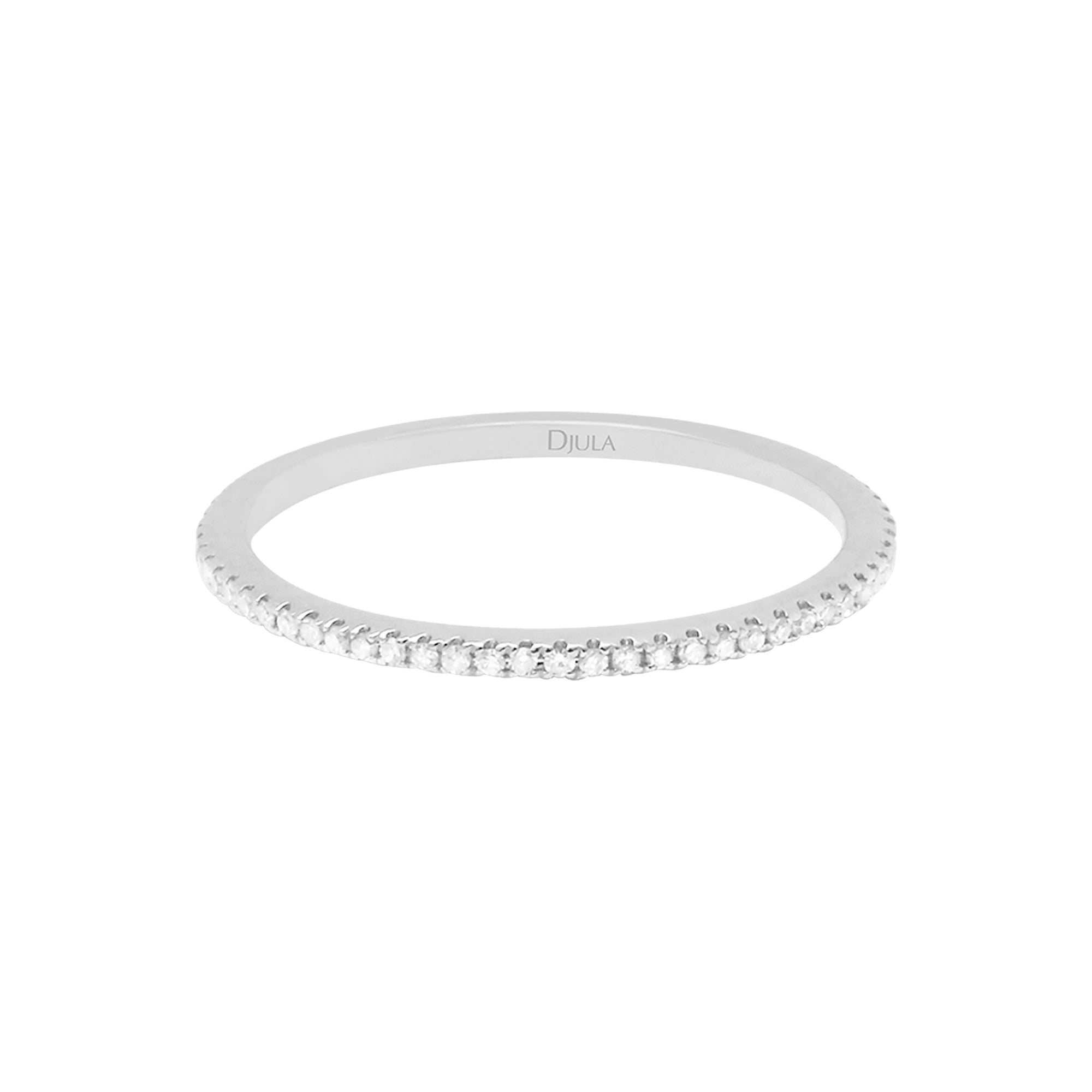 Anillo infinito de la marca Djula elaborado en oro blanco 18kt y decorado con diamantes que suman un total de 0.11 quilates. Su diseño delicado presenta una línea continua de diamantes que aporta brillo sutil y elegancia.
