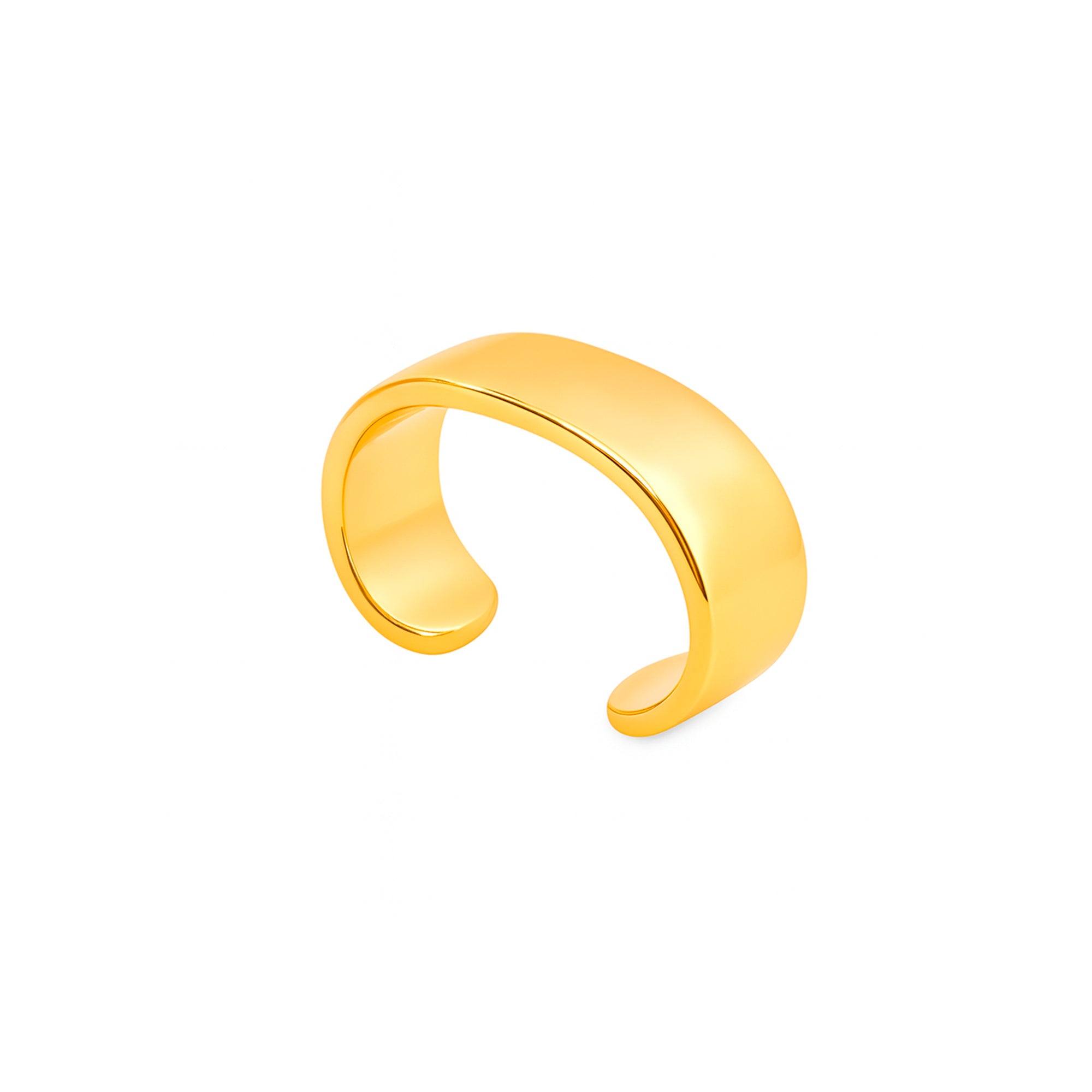 Este ear cuff en oro amarillo de 18 quilates es una pieza de diseño minimalista y sofisticado. Su forma ancha y pulida envuelve la oreja con un brillo intenso, aportando un estilo moderno y elegante sin necesidad de perforación.