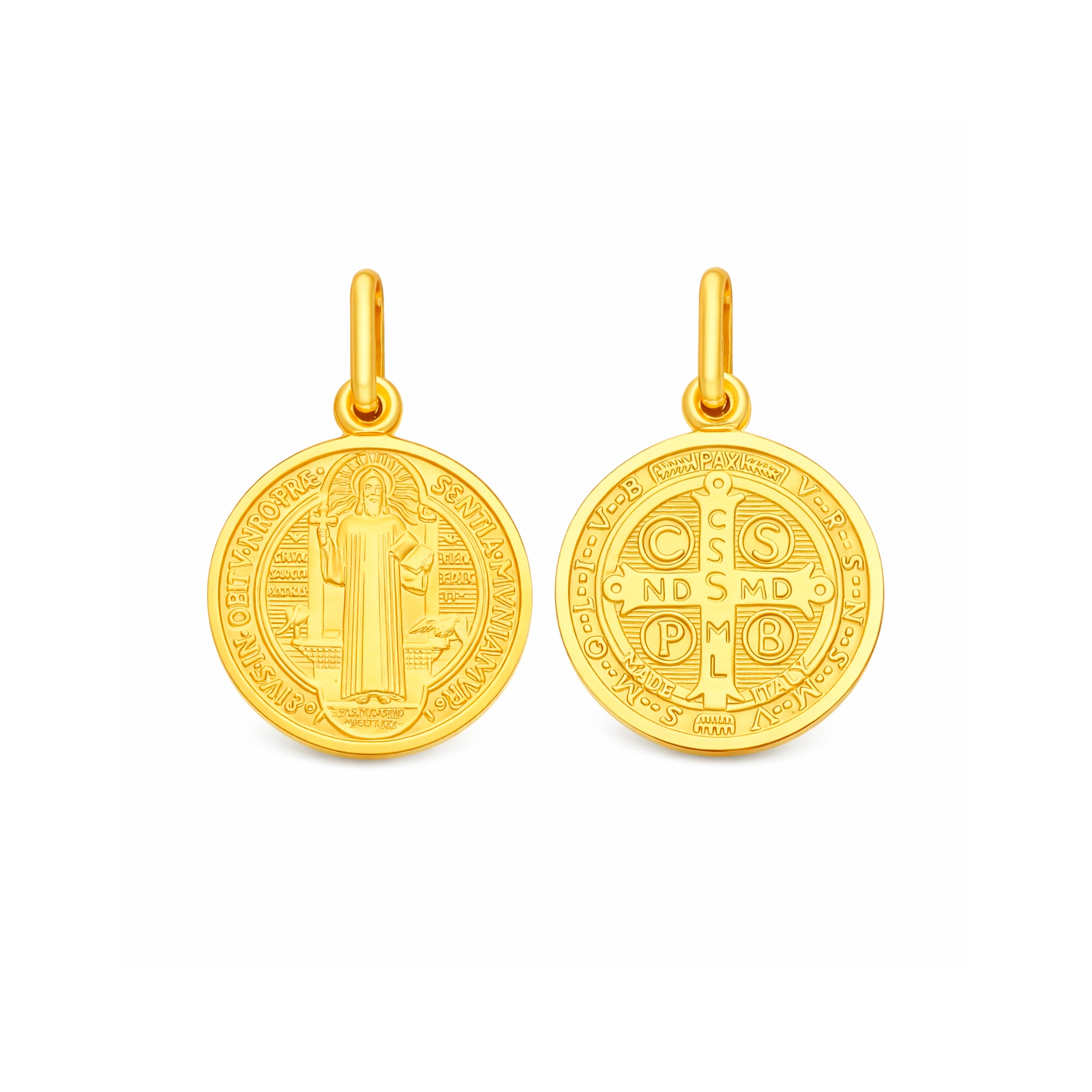 En su anverso y reverso se representan los símbolos clásicos de la medalla de San Benito, reconocida por su significado de protección, fe y fortaleza, convirtiéndola en una joya atemporal y cargada de intención.