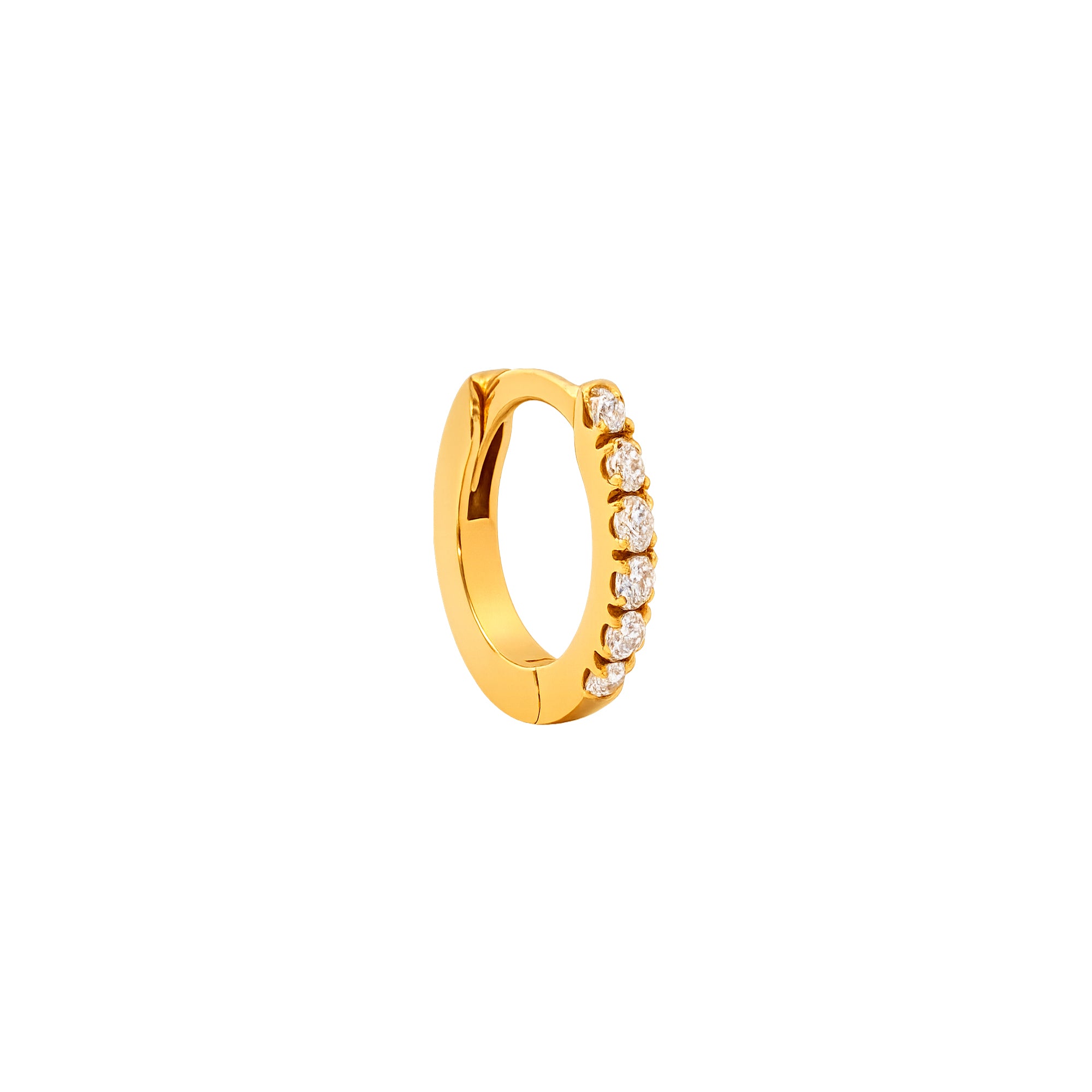 Aro individual en oro 18k con diamantes corte brillante engastados en media argolla, un diseño clásico y sofisticado que aporta brillo en cada movimiento. Su estructura fina y elegante lo hace perfecto para usar en el lóbulo o en perforaciones de cartílago, ideal para quienes buscan un look atemporal con un toque de lujo.