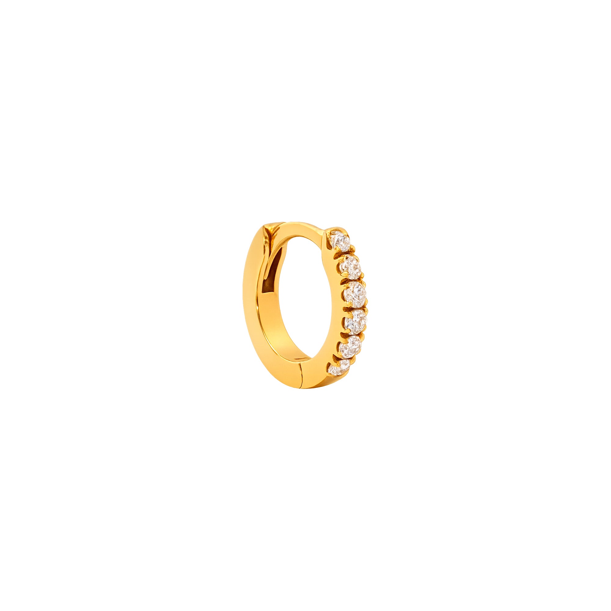 Aro individual en oro 18k con diamantes corte brillante engastados en media argolla, un diseño clásico y sofisticado que aporta brillo en cada movimiento. Su estructura fina y elegante lo hace perfecto para usar en el lóbulo o en perforaciones de cartílago, ideal para quienes buscan un look atemporal con un toque de lujo.